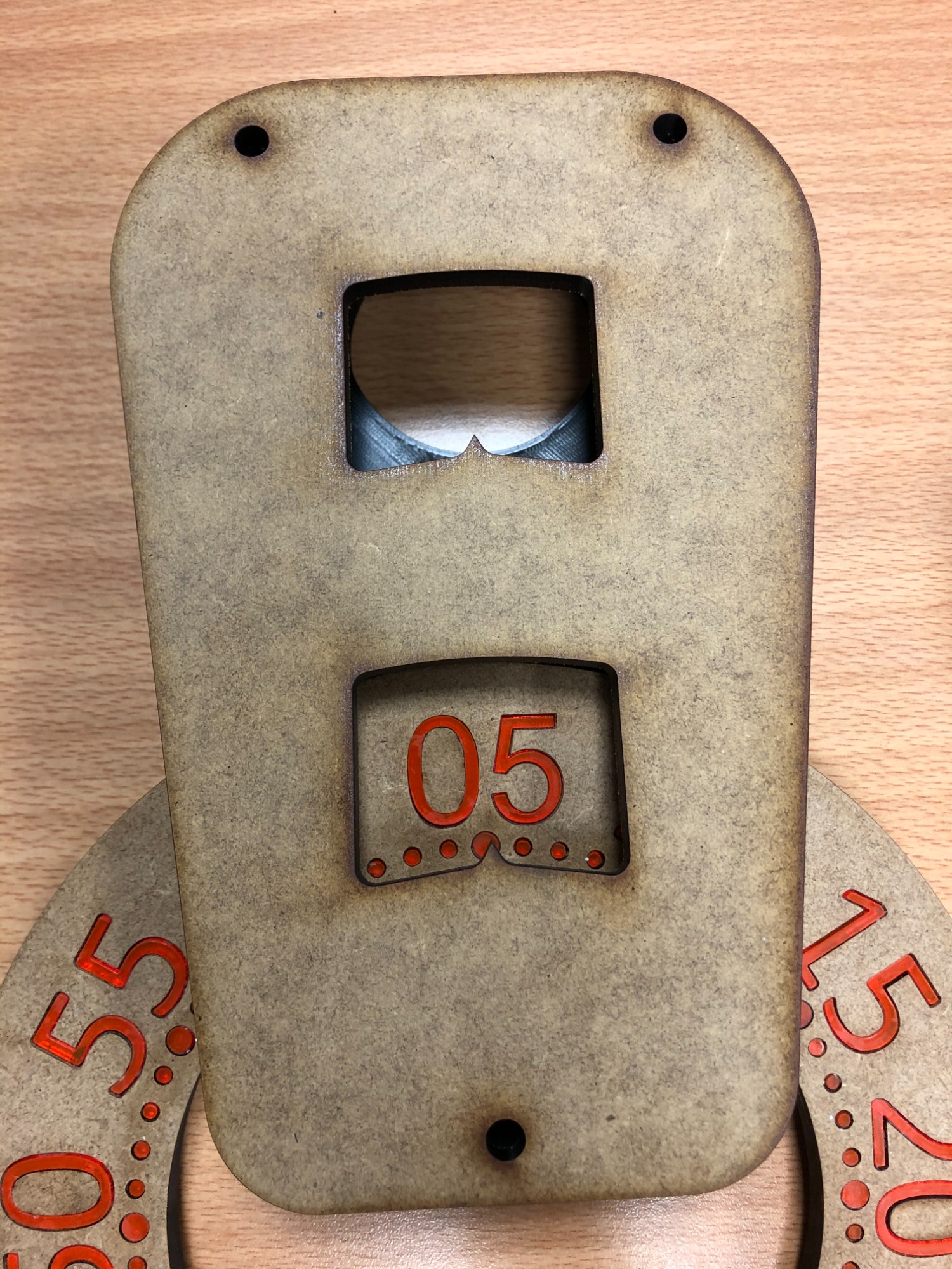 Prototype d’horloge innovante dont la lecture du temps se fait par le mouvement du cadran, en remplacement des aiguilles traditionnelles.